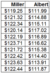 Miller의 평균은 121.92, Albert의 평균은 114.81이므로 Miller의 상품과 Albert의 상품의 가격이 다르다고 주장할 수 있음을 검증하자.