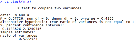 >> f-test의 결과, p값이 유의수준(0.05)보다 크기 때문에 H_0를 채택한다. 즉, 두 집단은 등분산임을 주장할 수 있다.