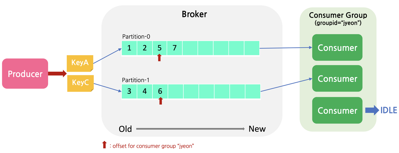 2) key가 지정되어있으면, 해당 key를 가지는 데이터는 항상 같은 Partition으로 보내짐. - 하나의 Partition에 대해 같은 Consumer Group 내 여러 Consumer가 이용할 수 없음.
