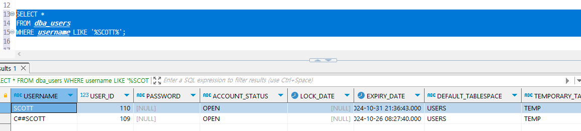 | -- ORACLE_SCRIPT = TRUE 옵션 설정 ALTER SESSION SET "_ORACLE_SCRIPT" = TRUE; -- 오라클 사용자 생성 CREATE USER scott IDENTIFIED BY tiger; -- 권한 설정 GRANT CONNECT, RESOURCE TO scott; -- TS 권한 부여 ALTER USER scott DEFAULT TABLESPACE users QUOTA UNLIMITED ON users; |